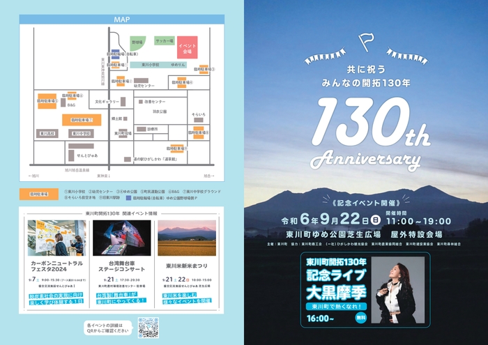 さらに、関連イベントとして「ゼロカーボンフェスタ2024」「台湾ナイトコンサート」「新米祭り2024」など、130年を祝う特別なイベントが多数開催されます。ぜひ、これらのイベントにも足をお運びいただき、9月の夏の終わりは東川町で特別なひとときをお楽しみください。