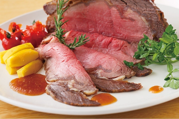 じっくりと火入れすることでしっとりとジューシーに仕上がったローストビーフの美味しさはもちろん、見た目も豪華なテンションの上がる一品です。