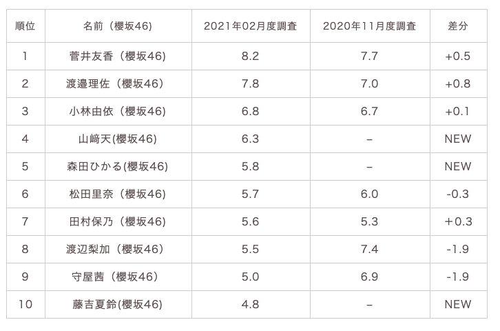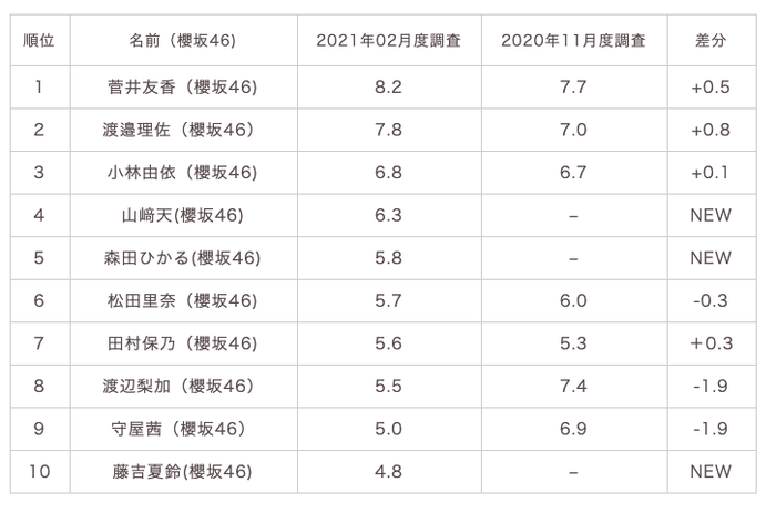 メディア露出の機会が増えたキャプテン菅井友香が1位に。その他にもモデルとしても活躍する小林由依や女優としても活躍する渡邉理佐など一期生がトップ3を占めています。