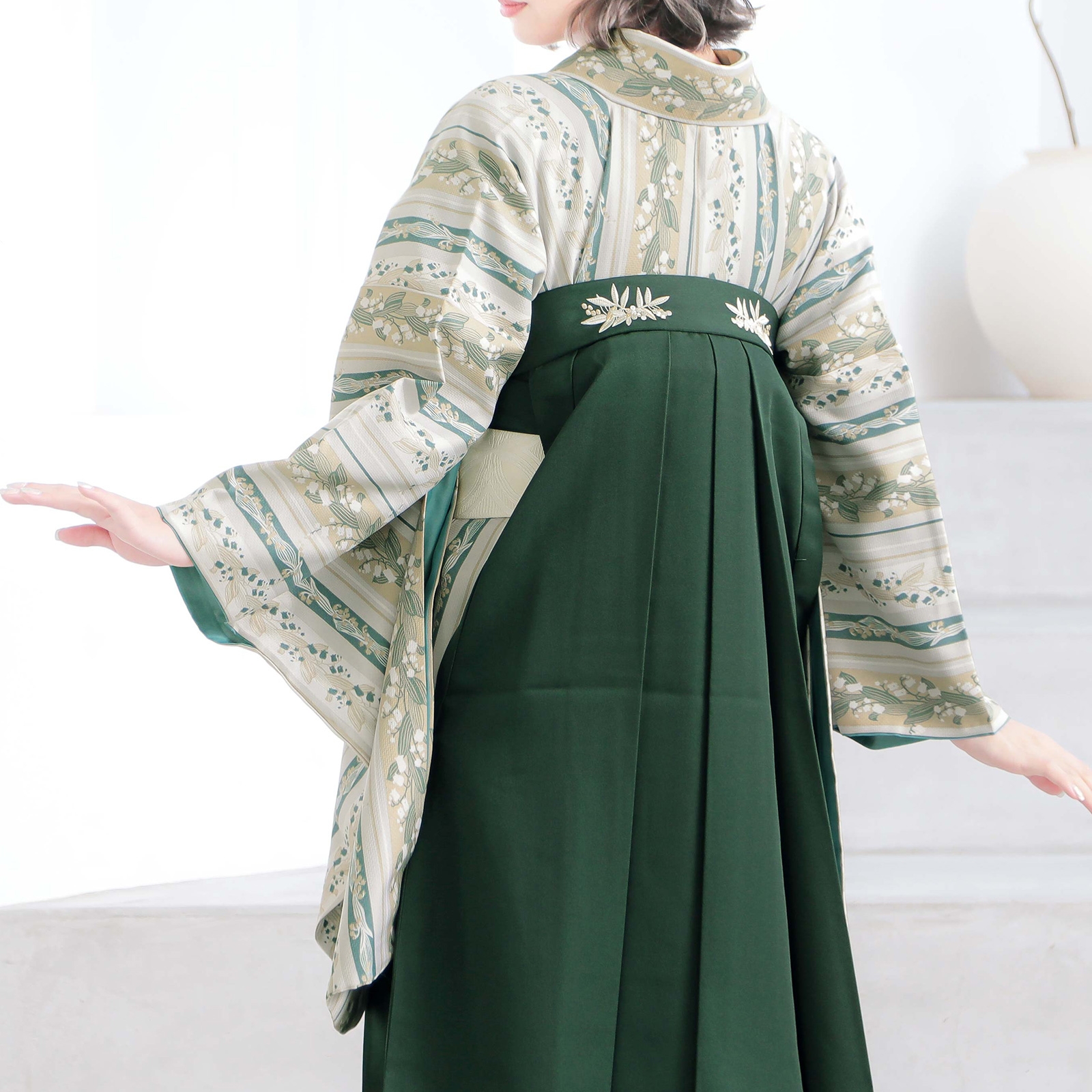 淡いグレー地にオフホワイト、黄みのベージュと青緑色の縦縞の中に、抽象的に表現された大小のスズランの連続模様が配置されています。