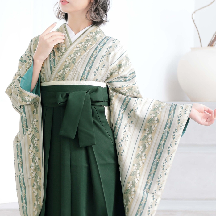 二尺袖着物は小振袖の一種で、袖の長さが二尺(約76cm)であることが名称の由来です。特長としては、振袖に比べて袖が短い、袖が短いので動きやすい、袴と合わせた時のバランスが良いなどがあげられます。二尺袖を袴に合わせるスタイルの「二尺袖袴」は、卒業式を迎える学生の方々に人気です。