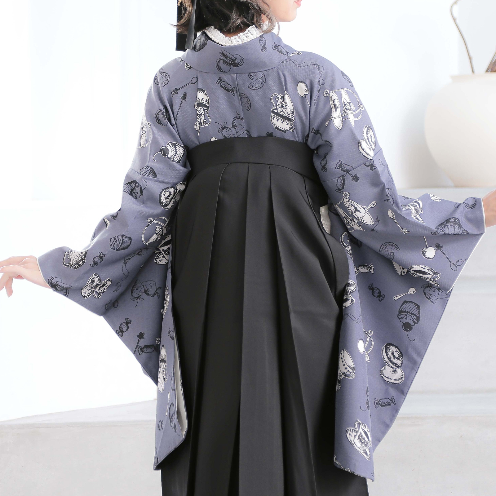 地の色は、ウィスタリア(青藤色)にグレーを掛けたような微妙な色合いの鈍い青紫色をしています。黒の線で表現された茶器やお菓子、フルーツなどアフタヌーンティーの品々を散らした模様です。ブルーベリークリームチーズを暗めにしたような色味がアフタヌーンティーらしく、大人っぽい魅力も感じさせます。