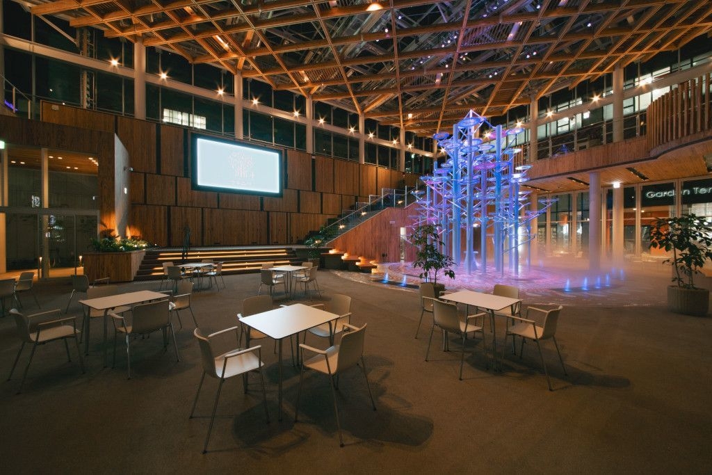 天井には県産材の格子のデザインにより日中は“自然光”を取り入れながら木陰をつくり、夜間は照明を効果的に灯すことで、まちの行灯としての機能も果たす、都会的な空間としての一面を持ち合わせています。