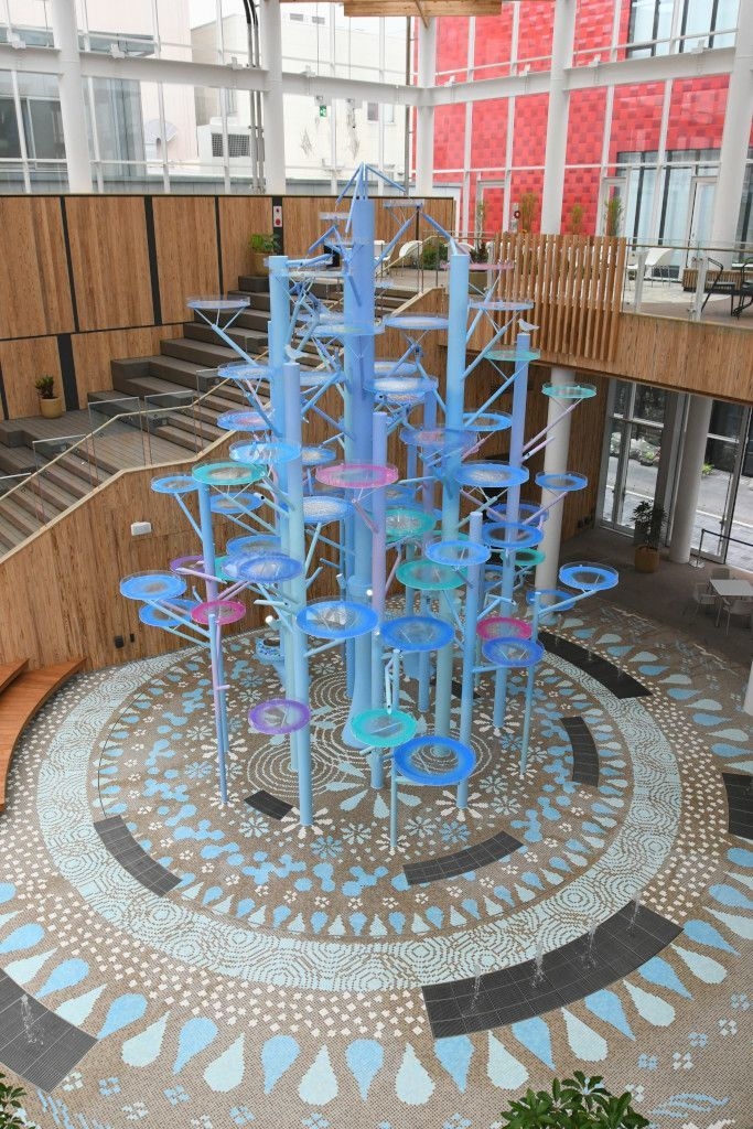 青森県三沢市出身のアートディレクター、森本千絵さんが監修。定刻になると素敵な音色でお知らせします。水の樹の根元には、水の波紋をイメージした模様が描かれています。