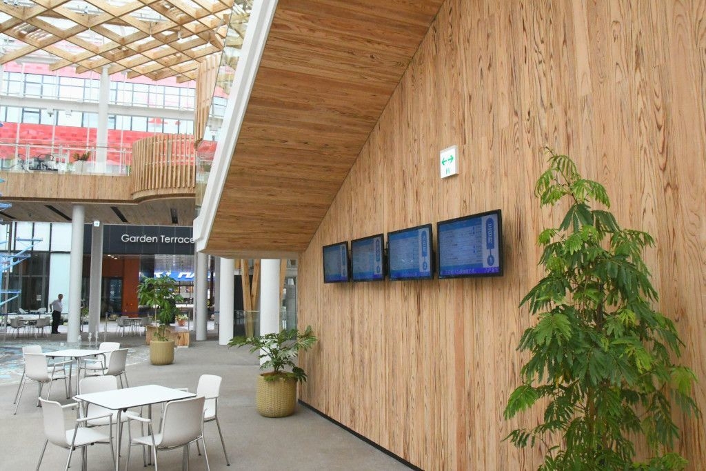 マチニワは、都市における“光・緑・水などの自然を感じられる場所”であるとともに、“市民の新しい活動・交流が促進される場所”というコンセプトに基づき、大型ガラスに覆われた洗練された外観とは対称的に、内装には県産材の南部赤松や杉を多用しており、2階デッキに配された植栽とともに自然の温もりを感じられ、訪れた方に安らぎを与えるような空間になっています。