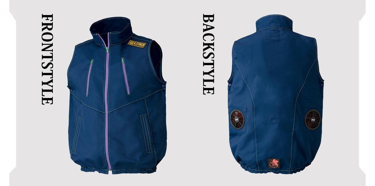 「空調ベスト(TM)」はネイビーカラーをベースに初号機のイメージを取り入れたクールかつコーディネートを選ばず合わせやすいデザインになっています。暑い夏でも快適に作業ができます。