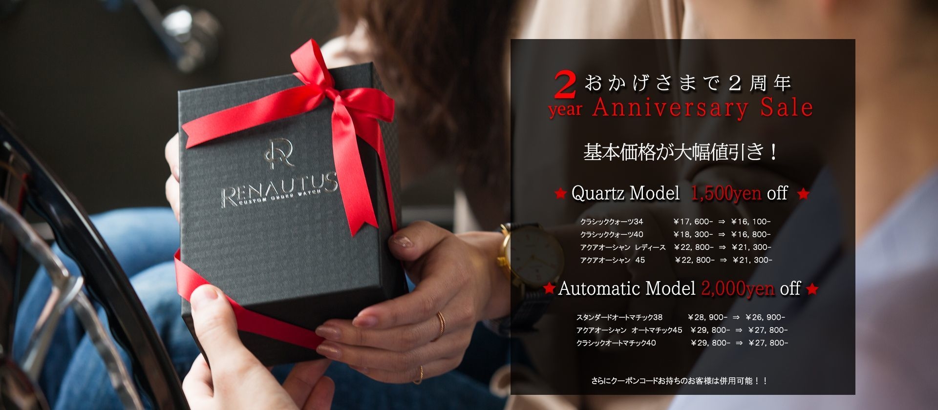 株式会社ルノータス(本社:奈良県天理市、代表取締役:松原 弘光)は、『カスタムオーダーウォッチ ルノータス』のサービス開始2周年を記念し、7種のモデルを期間限定(2018年8月24日~9月8日)で割引販売いたします。