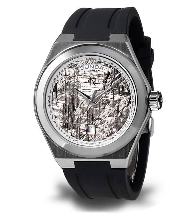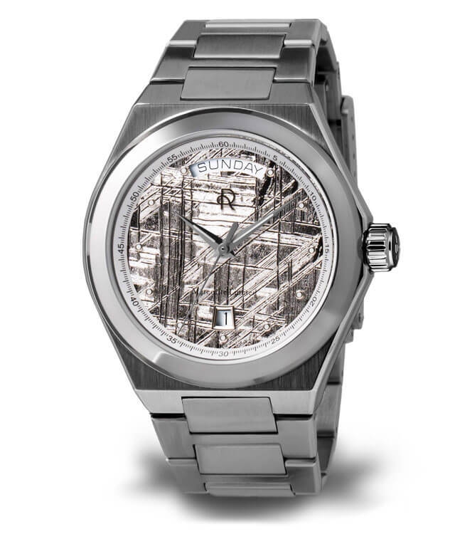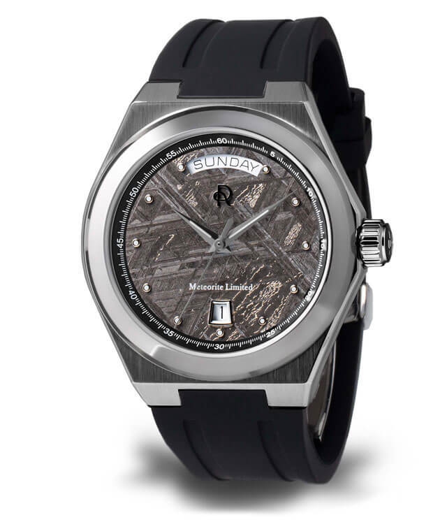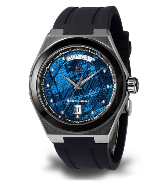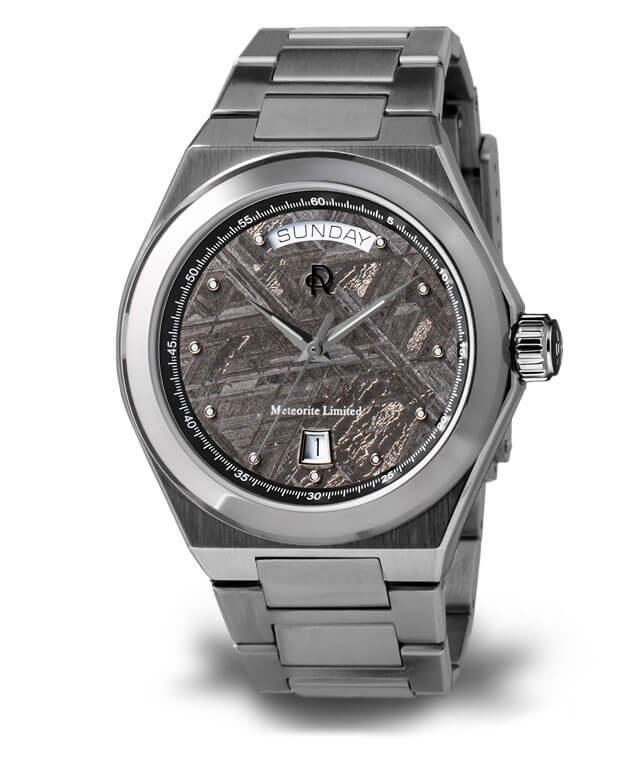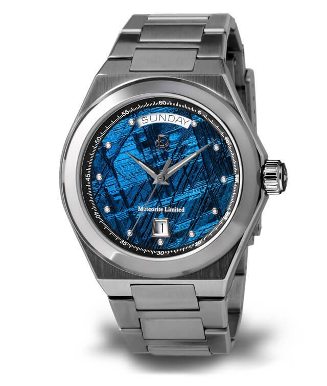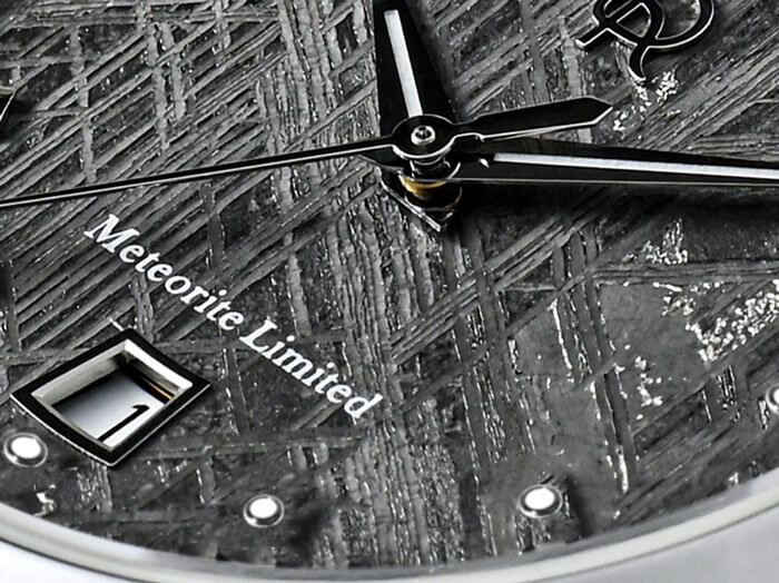 希少なメテオライト(隕石)を僅か0.4mmにカットした文字盤と信頼のスイス・ETA製を使用したリミテッドモデルは、デイデイト表示を搭載しています。