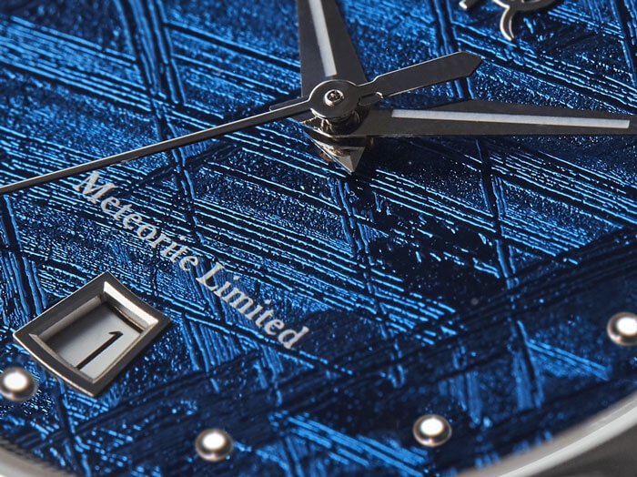 ブルーモデルは、ブルーコートを施すことで隕石特有の模様を残しつつ深みのある青が印象的な文字盤に仕上げました。