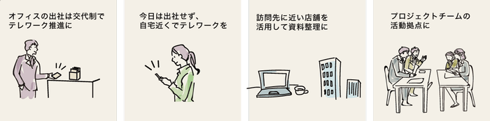 「いいオフィス」の利用を企業単位で契約し、国内148店舗のコワーキングスペースをいつでも何度でも利用できるカードを発行します。これにより、事業運営コスト削減・離職抑制・就労継続支援・従業員のワークライフバランス向上・生産性向上・多様な働き方実現などに貢献いたします。