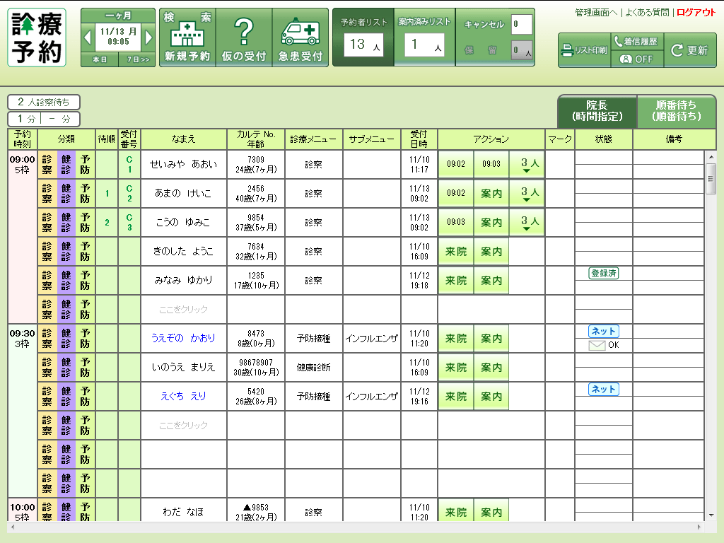 ・クリニックは時間帯予約制の運用がしやすく設計された予約画面を利用して予約を管理します。