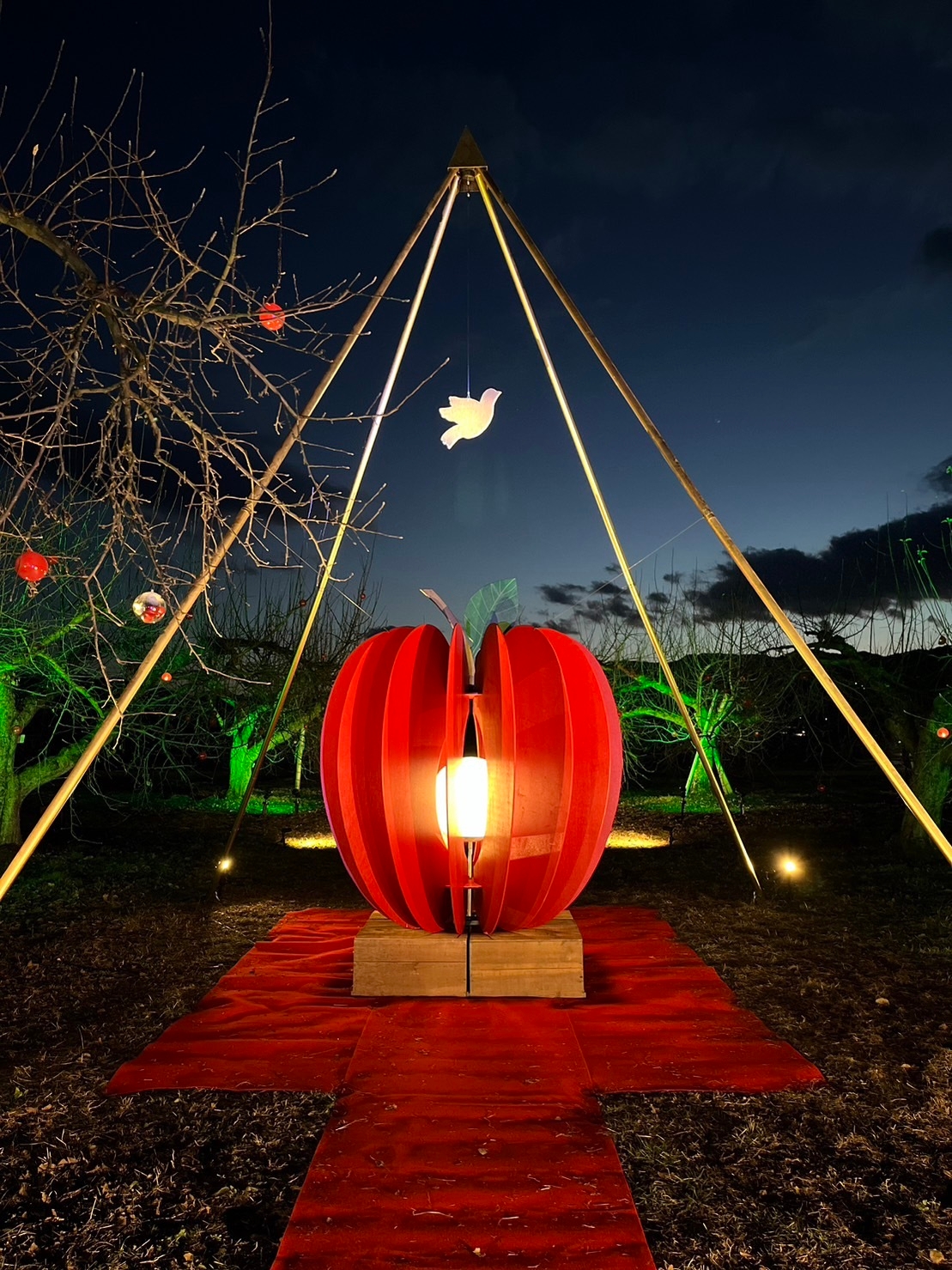 『りんごのオブジェライト』までの道は、レッドカーペット敷きの通路となり、りんごの木には、りんごをイメージした赤い灯体が180球飾り付けられます。