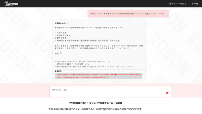今回提供を開始する『労務相談ロボット』は、労務に関する悩みを生成AIのチャットに質問するだけで、出典の明示と共に要約した文章を回答するサービスです。質問できる対象項目は労働基準法、労働契約法、労働組合法、労働関係調整法、労働安全衛生法、職業安定法、最低賃金法、障害者基本法で、企業の人事労務担当者や社会保険労務士の皆さまにご活用いただける領域をカバーしています。