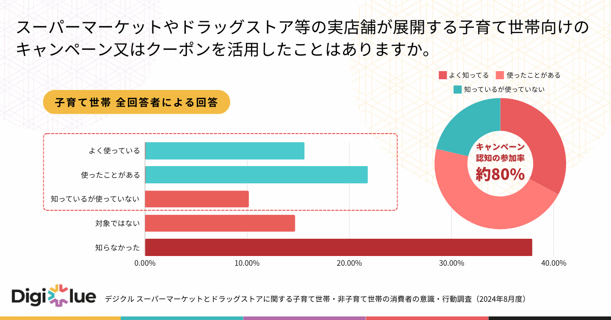 ・これまでの設問から、子育て世帯はそうでない世帯に比べてクーポンやポイント還元率に関心が高く、価格の安さを重視していることが分かった。このことから、子育て世帯に対する認知の拡大が進めばより多くの参加を得られる可能性が高いことが予想される。