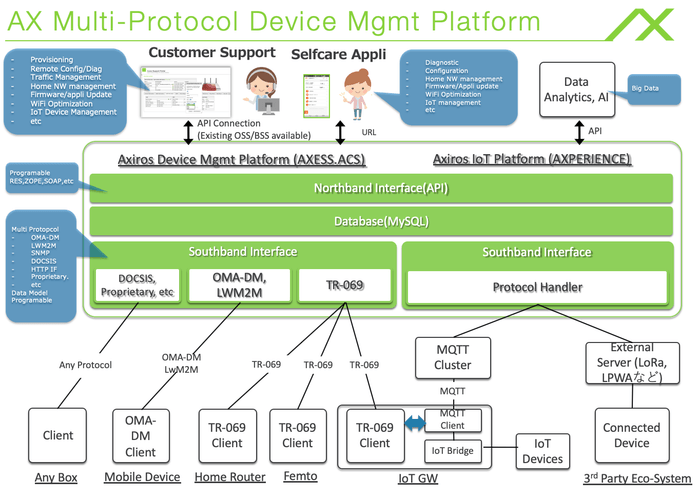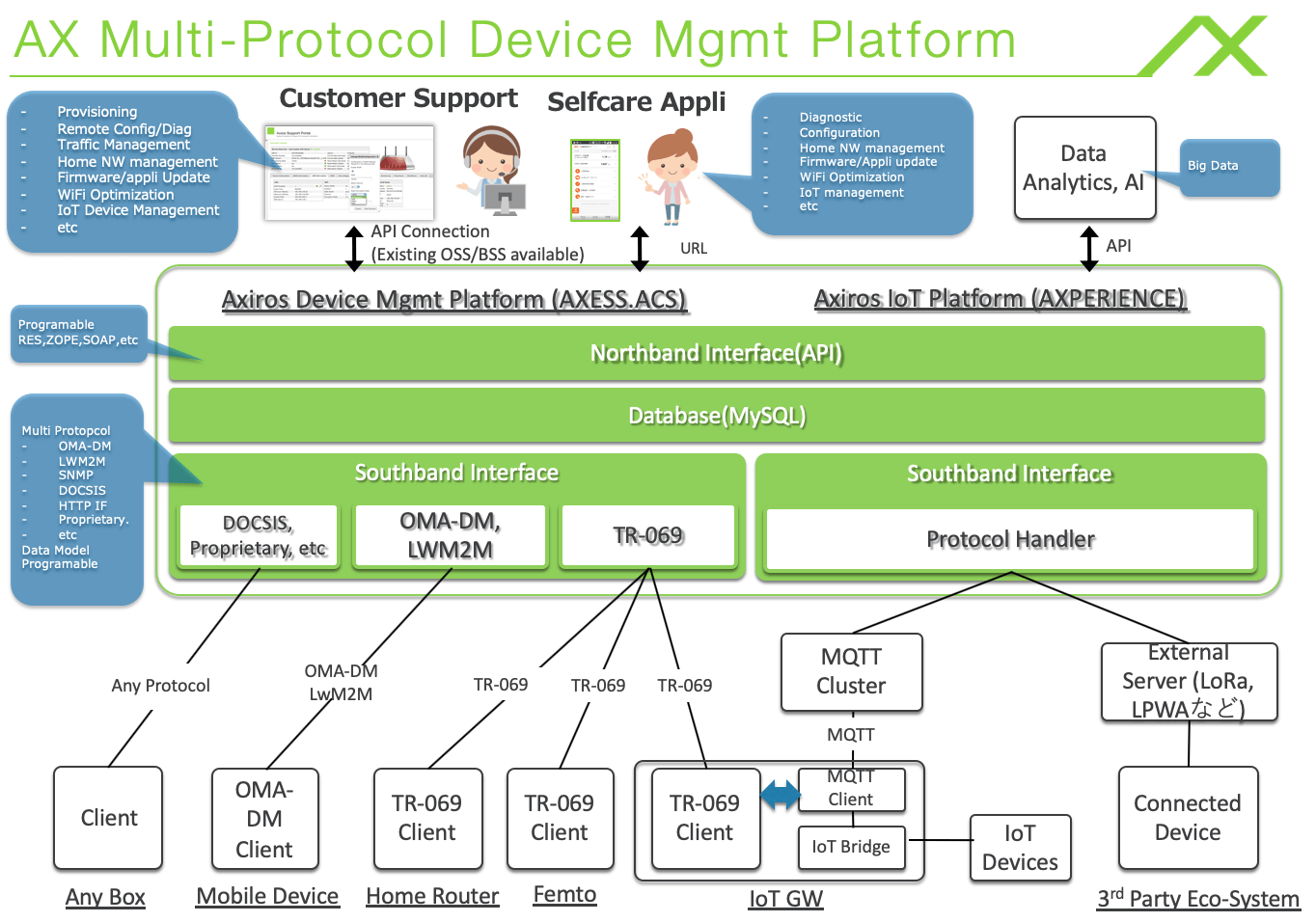 アキシロスのAXESS ACSは、家庭向け並びにビジネスサービス向けとしたデバイス管理の自動化を実現するOSSプラットフォームです。AXESS ACSは複雑なオペレーションを実行できるようデザインされており、設定、ファームウェア管理、障害対応、顧客サポート等のためにサービスプロバイダーが必要とする十分なスケーラビリティとフレキシビリティを備えております。