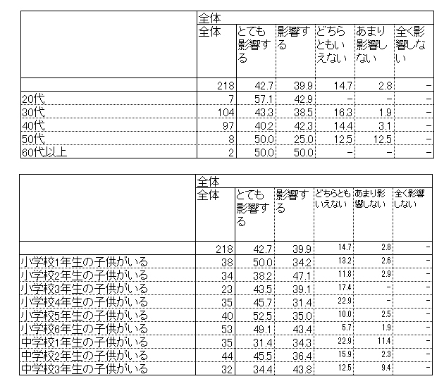 「心配している」と回答した人のうち、そのことが仕事に影響するかを尋ねたところ、「とても影響する」(42.7%)「影響する」(39.9%)という回答を合わせると、8割を超える結果となり、働く母親にとって、子供の体調や安否が業務に影響を与えることが明らかとなった。