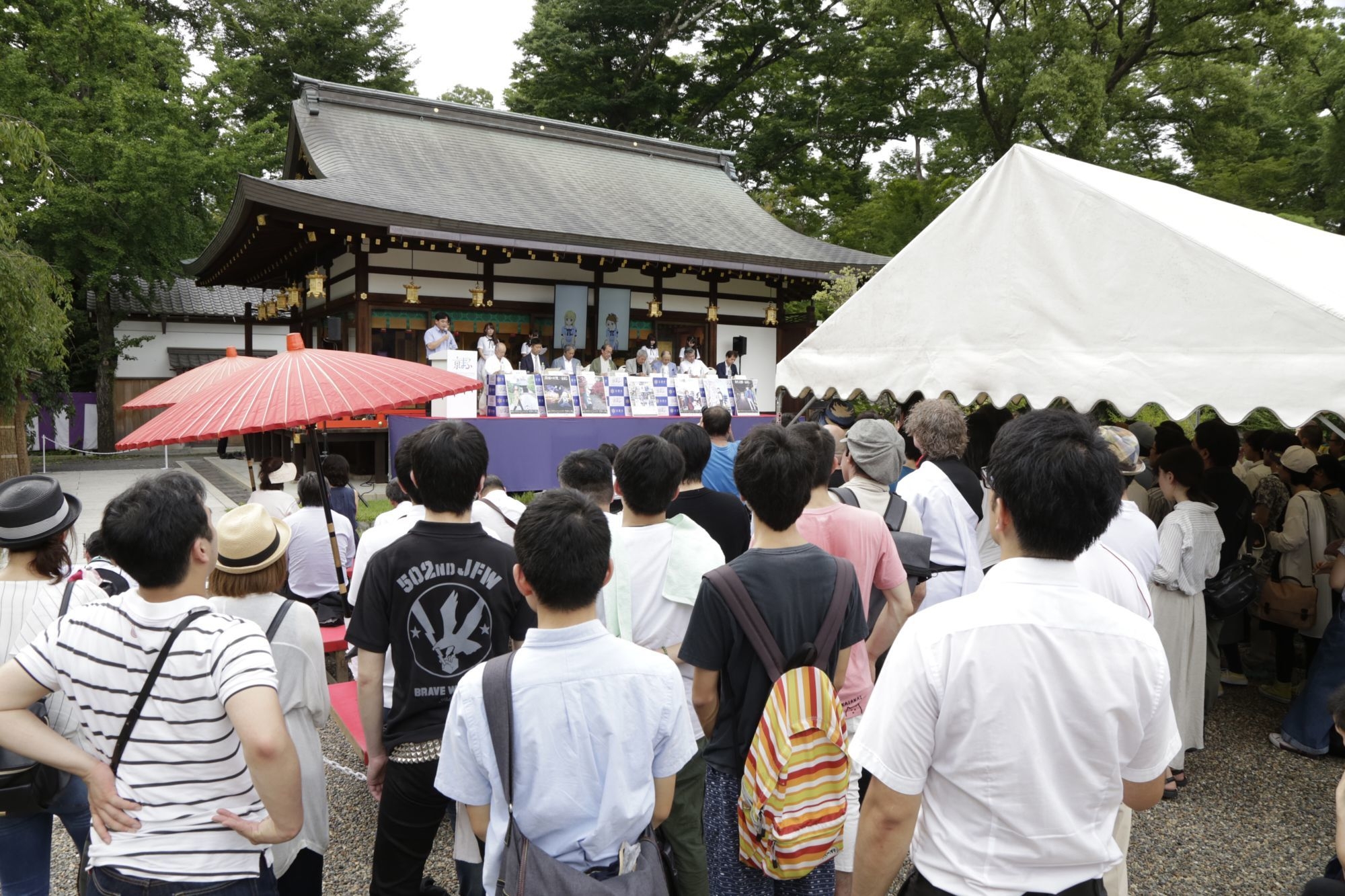 記者会見会場では、門川京都市長をはじめ、実行委員会のメンバーと共に『京まふ』応援サポーターの「22/7(ナナブンノニジュウニ)」も参加し、ステージラインナップの発表と「22/7×全国天満宮の総本社 北野天満宮」のコラボビジュアルも初披露されました。