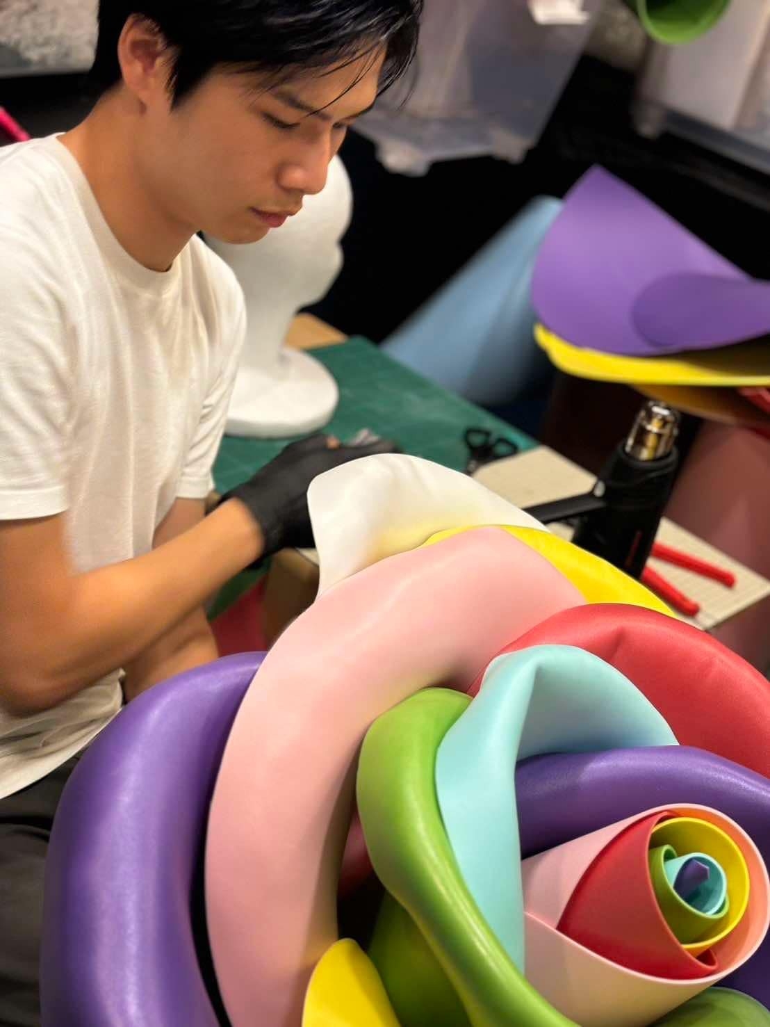 ジャイアントフラワーを始めたきっかけはコロナ後のイベントが復活する際の、ホテルからイベント装飾の依頼でした。装飾提案を行った際に「生花など捨てるものは使わないで欲しい」と要望されたのです。2021年ごろからヨーロッパで始まり韓国で大流行していた、「ジャイアントフラワー」に着手、日本にはない次世代のお花の形でもあり、技術習得に3年かかりました。