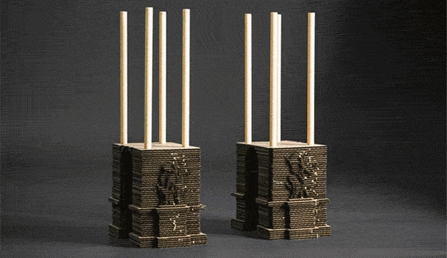 使うのは段ボールと接着剤のみ。土台に基準となるスティックを何本か立て、その間を通すようにパーツを重ねて組み立てていきます。単純な作業ですので、工作が苦手な方も手軽に取り組むことができます。