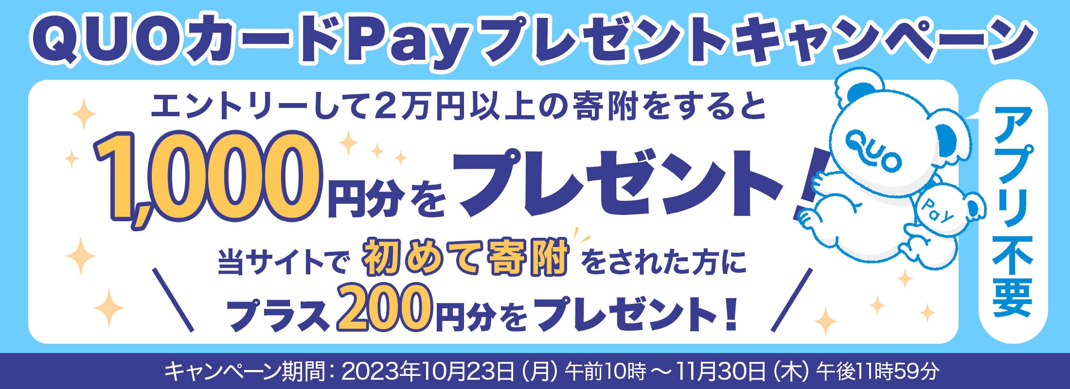 2万円以上の寄附&エントリーでQUOカードPay1,000円分をプレゼント。