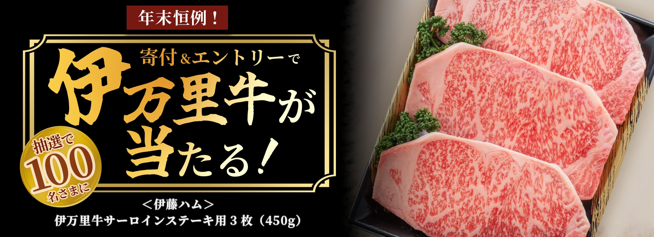 会期中、寄附&エントリーしていただいた方の中から、抽選で100名さまに<伊藤ハム>伊万里牛サーロインステーキ用をプレゼントいたします。