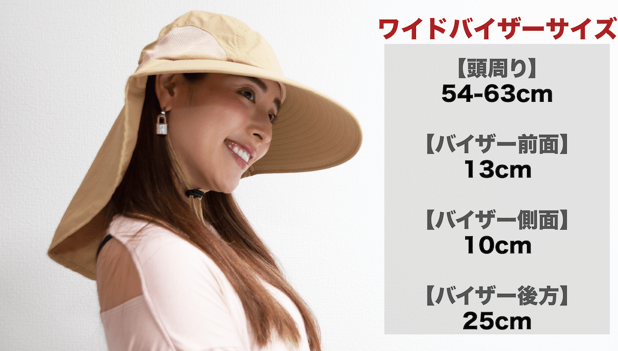 これまでの帽子の常識を覆す超ビッグサイズの作りとなっています。これにより後頭部から首筋までまるまる紫外線をカバーします。