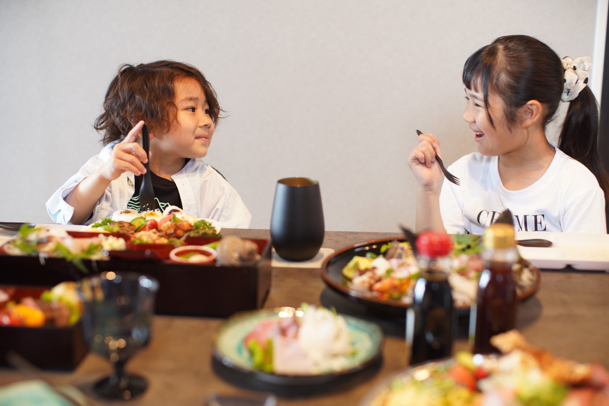 夕食では地元の名店「小料理 なかお」さんによる手作り懐石料理やオードブルを提供。食材は淡路島産にこだわっています。地魚を中心とした料理だけでなくお子様ランチも注文可能です。そしてイチオシはなかお特製BBQセット。淡路牛をはじめとするスペシャルな内容となっています。BBQの設備も宿に完備しているので手ぶらでBBQが楽しめます。