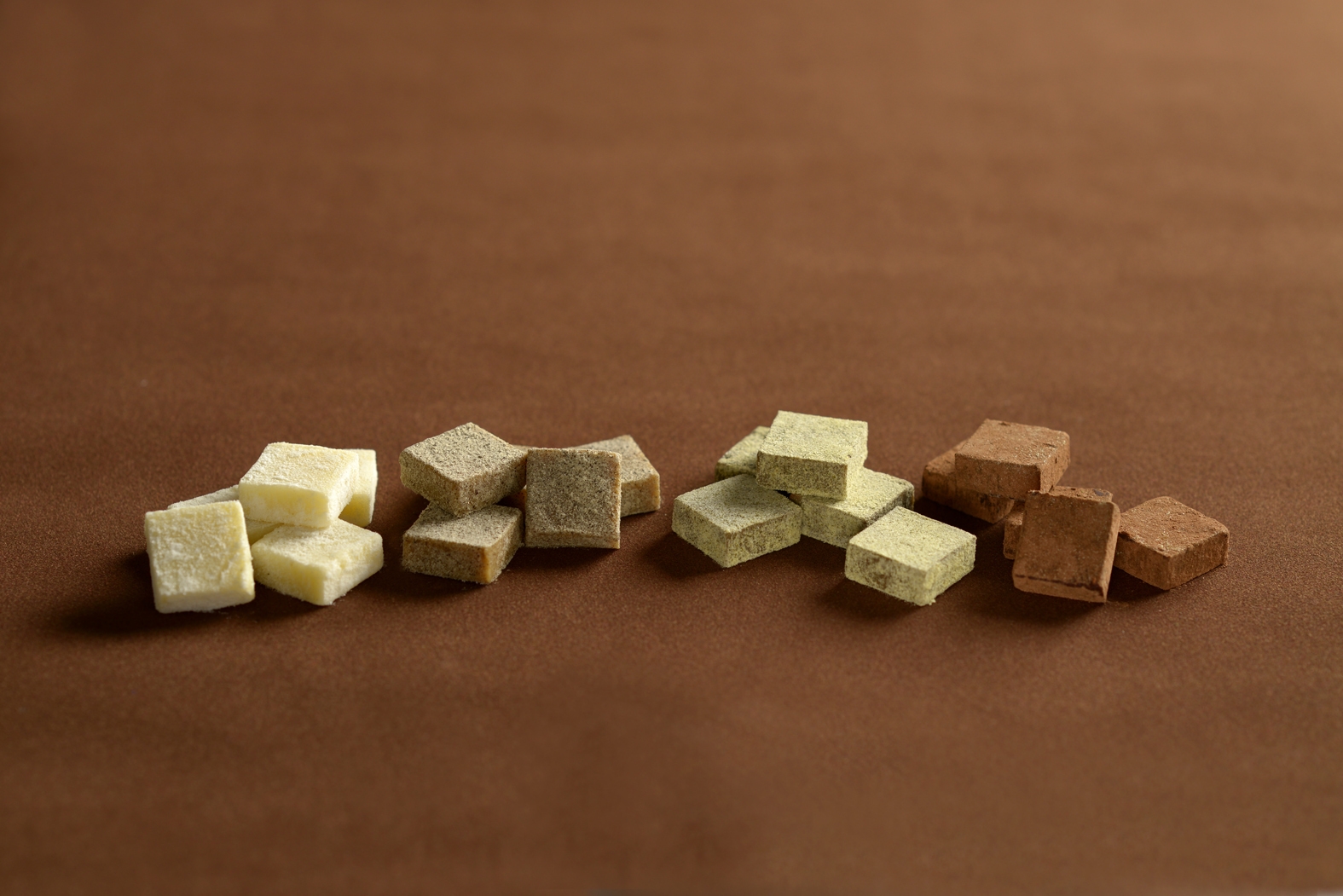 新たな4種のチョコレートは、ボンボンショコラではなく、よりデリケートなテクスチャーの「生チョコレート」とすることで、それぞれの素材の持つ希有な味と香りを最大限に引き出しました。