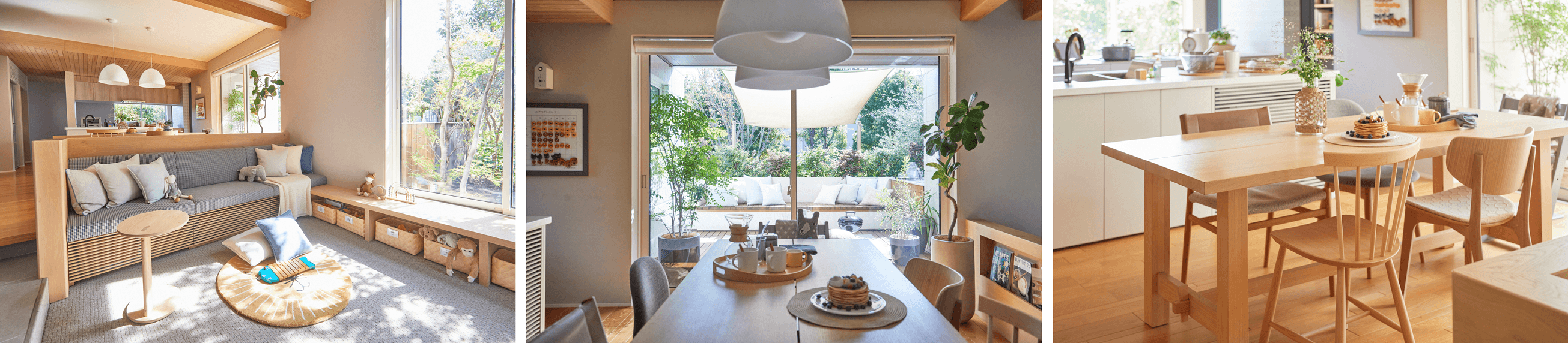 中央・右)自然な木色とホワイト色が優しい印象のダイニング