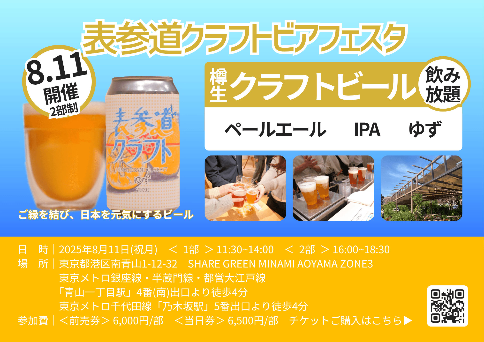 GOOD LIFE フェア 2024(東京ビッグサイト)でも好評を博し、渋谷のラジオでも紹介された表参道クラフト。その表参道クラフトが飲み放題のイベント「表参道クラフトビアフェスタ」を2025年8月11日(月・祝)に開催いたします。シリーズの中から、今回はペールエール・IPA・ゆずの3種を飲み放題メニューとして提供いたします。