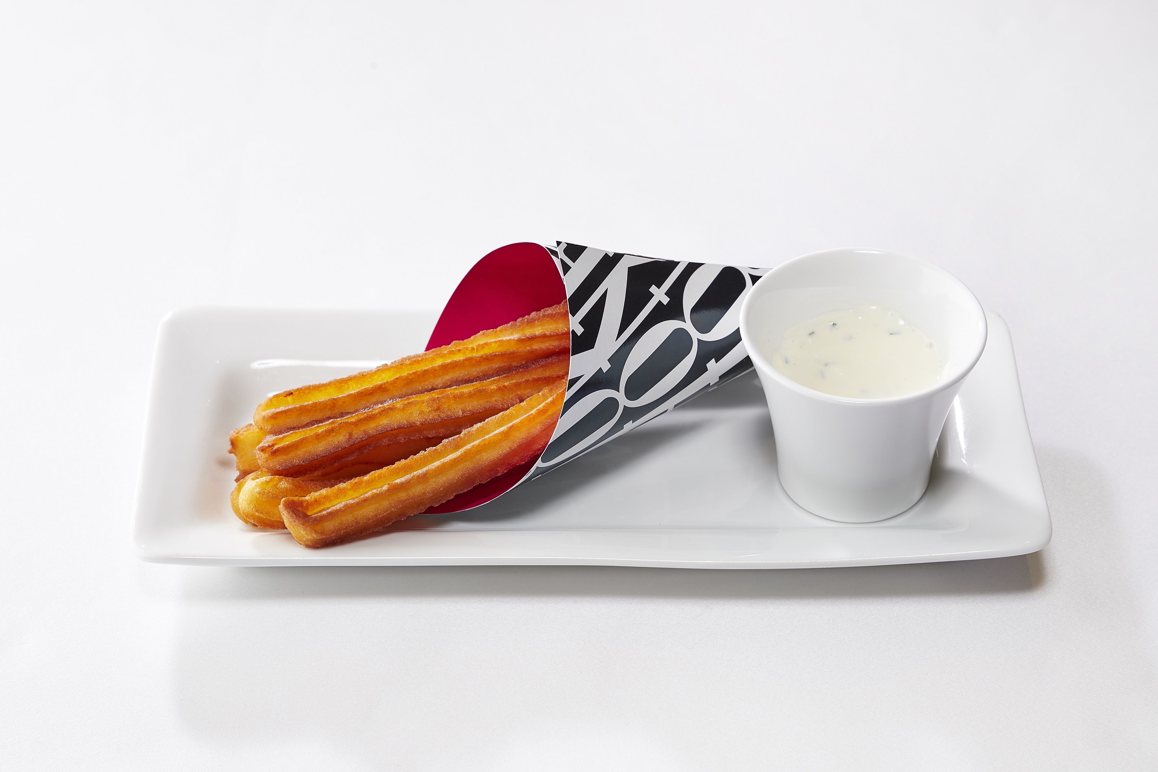 チュロスに見立てたフォションスタイルの塩味のポテト。レモン風味のさわやかなクリームをディップしてお召し上がりください