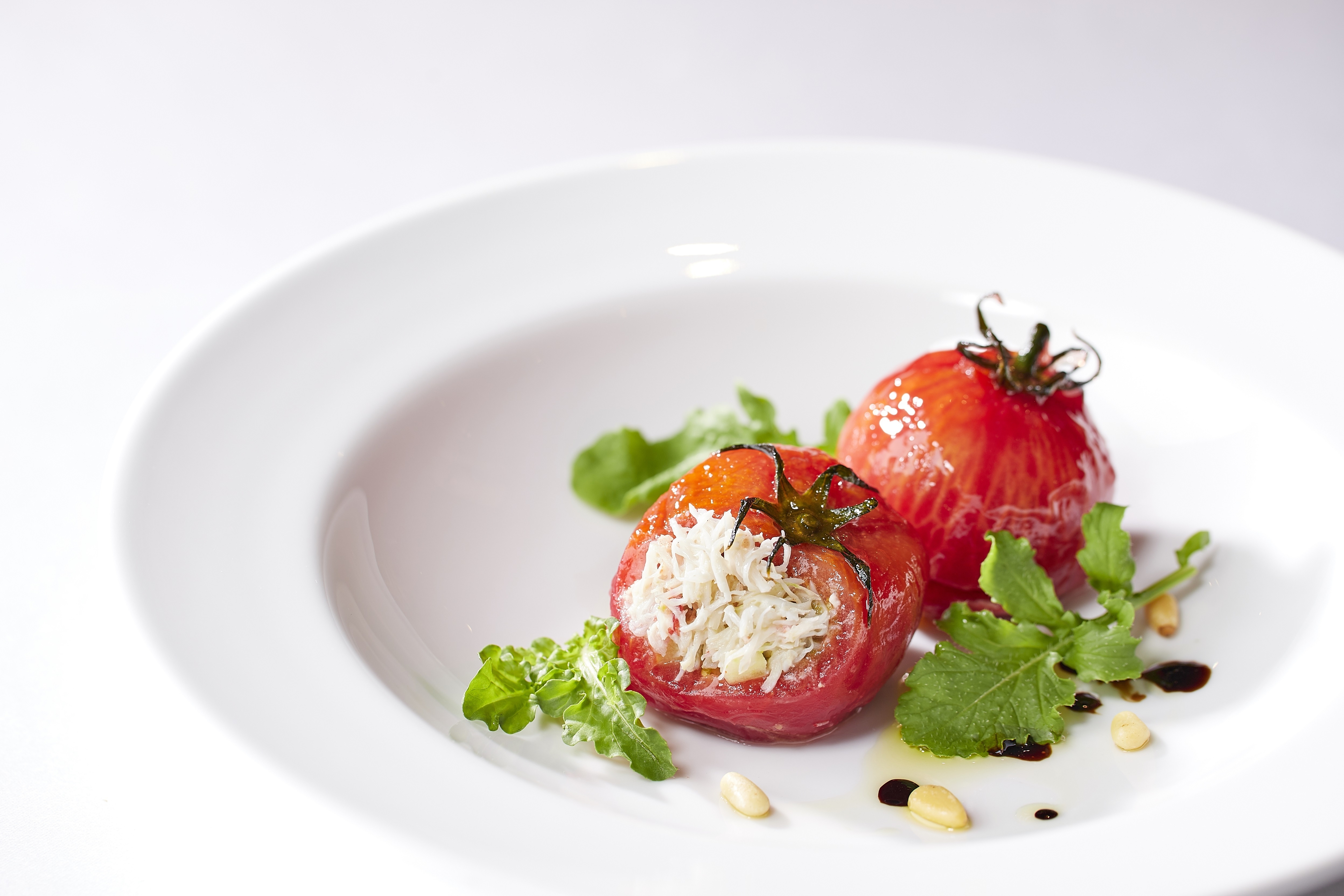 りんご飴に見立てたトマトの前菜。甘みの強いフルーツトマトに、カニ・アボカドを贅沢に詰めたフォションパリオリジナルのスペシャリテです
