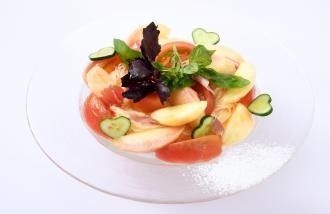 JA全農福島は、生産量全国2位の「ふくしまのトマト」と、3か月間約20種類の品種をリレーで味わえるとして人気の「ふくしまの桃」を楽しんでいただくため、松屋銀座の6階と8階のカフェ&レストランと地下1階のスイーツショップ“日本橋 千疋屋総本店”10ショップにてオリジナルメニューを展開いたします。今年は、梅雨明けが早かったものの、雨量は足りており、太陽をいっぱい浴びているため、“トマトも桃”も例年より熟しが早く、美味しく成長しました。開催時期のトマトは「桃太郎」「りんか」、桃は「あかつき」「まどか」という品種が主流になり、福島の自慢の品種のひとつになります。今回のフェアでは、食材をそのまま活かしたメニューやシェフの豊かな発想でアレンジしたメニューなど20種類が揃います。福島のもうひとつの主力の夏野菜“きゅうり”をハートや星型にして、見栄えにもこだわりました!