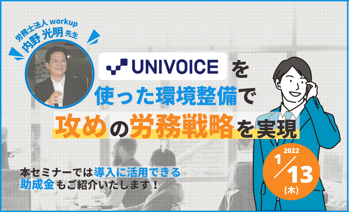 トラムシステム株式会社(本社:愛知県名古屋市名東区新宿2-25、代表取締役:梶田幸宏、以下:トラムシステム)は、2022年01月13日16時より、社会保険労務士法人workupと共催でUNIVOICEを使った環境整備法をはじめとするテレワークにおける労務戦略について解説する『UNIVOICEを使った環境整備で攻めの労務戦略を実現するセミナー 〜導入に活用できる助成金もご紹介〜』を開催いたします。