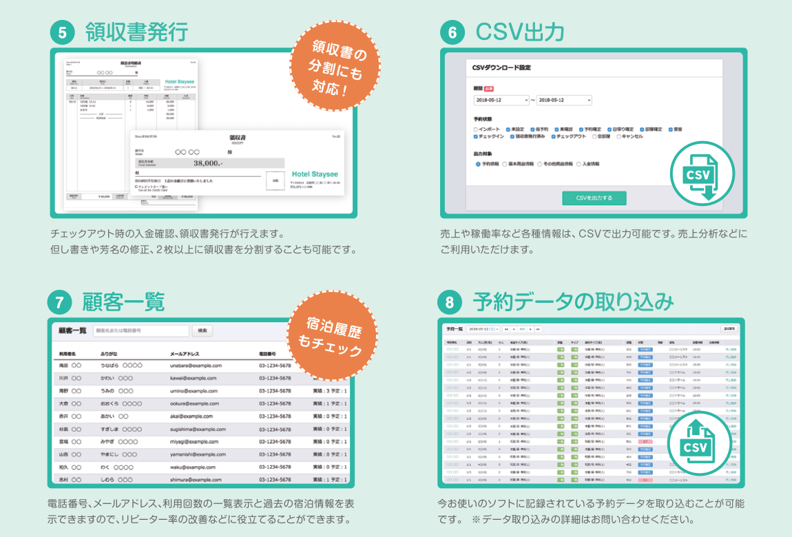 旅館、ホテル、カプセルホテル、民泊、ゲストハウス、ペンションで必要な予約管理業務、ネット予約の取り込み。チェックインカードや領収証の印刷。売上管理。料理管理がパソコンやタブレットで簡単に管理できるクラウド型のサービスです。