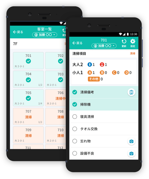 ・清掃スタッフのスマートフォン画面でお客様のチェックアウトやアメニティの数が部屋ごとに確認可能