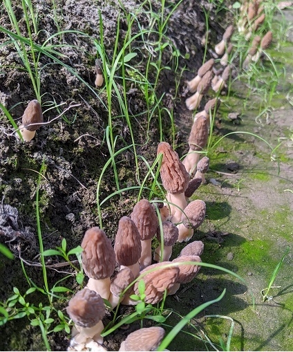 人工栽培に成功したアミガサタケの子実体は現在、体長5センチ~10センチ程度に生長しており、ツクシによく似た形状の子実体が、培地にしている土壌の地表面から伸びています。自然界では、桜の開花時期の4月ごろに野山に自生する希少なキノコです。ハルカ社では、2019年秋季から、準備作業を始めた培地から、菌糸の拡大を確認できたため、子実体の発生に備えて、管理作業を進めてきました。