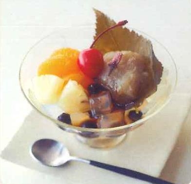 素焚糖を使った白餡を柔らかな桜の葉で包み、直火窯で炊きあげた豆やフルーツをトッピング。
