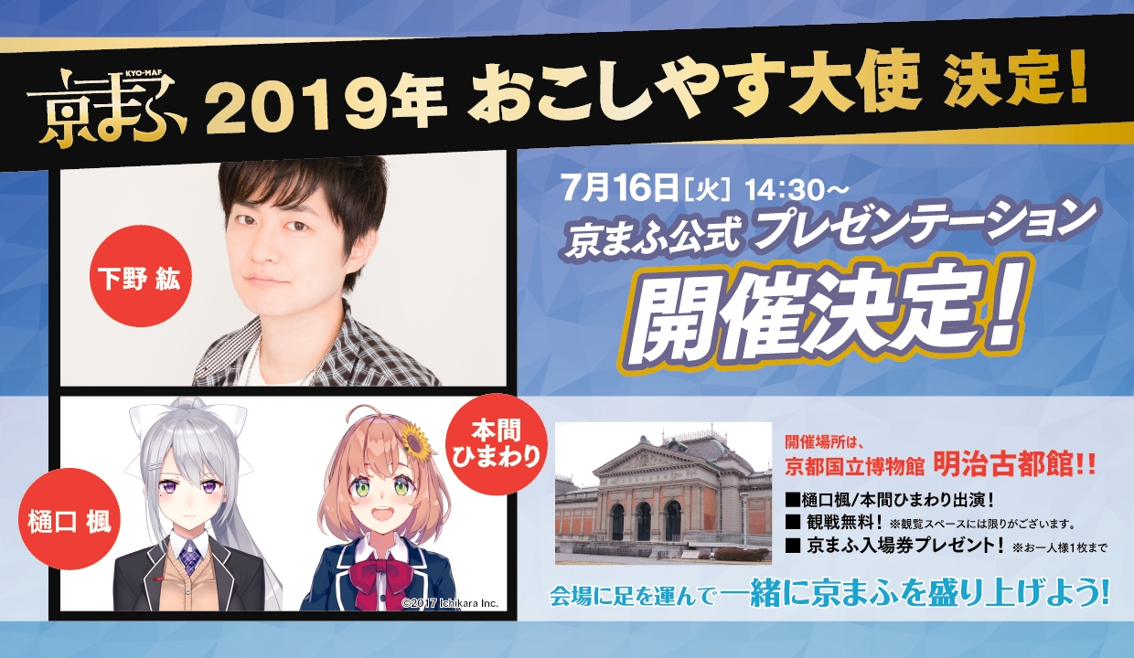 西日本最大級のマンガ・アニメイベント 『京都国際マンガ・アニメフェア2019(京まふ)』 声優下野紘・VTuberの樋口楓・本間ひまわりが 京まふ2019おこしやす大使に就任!!