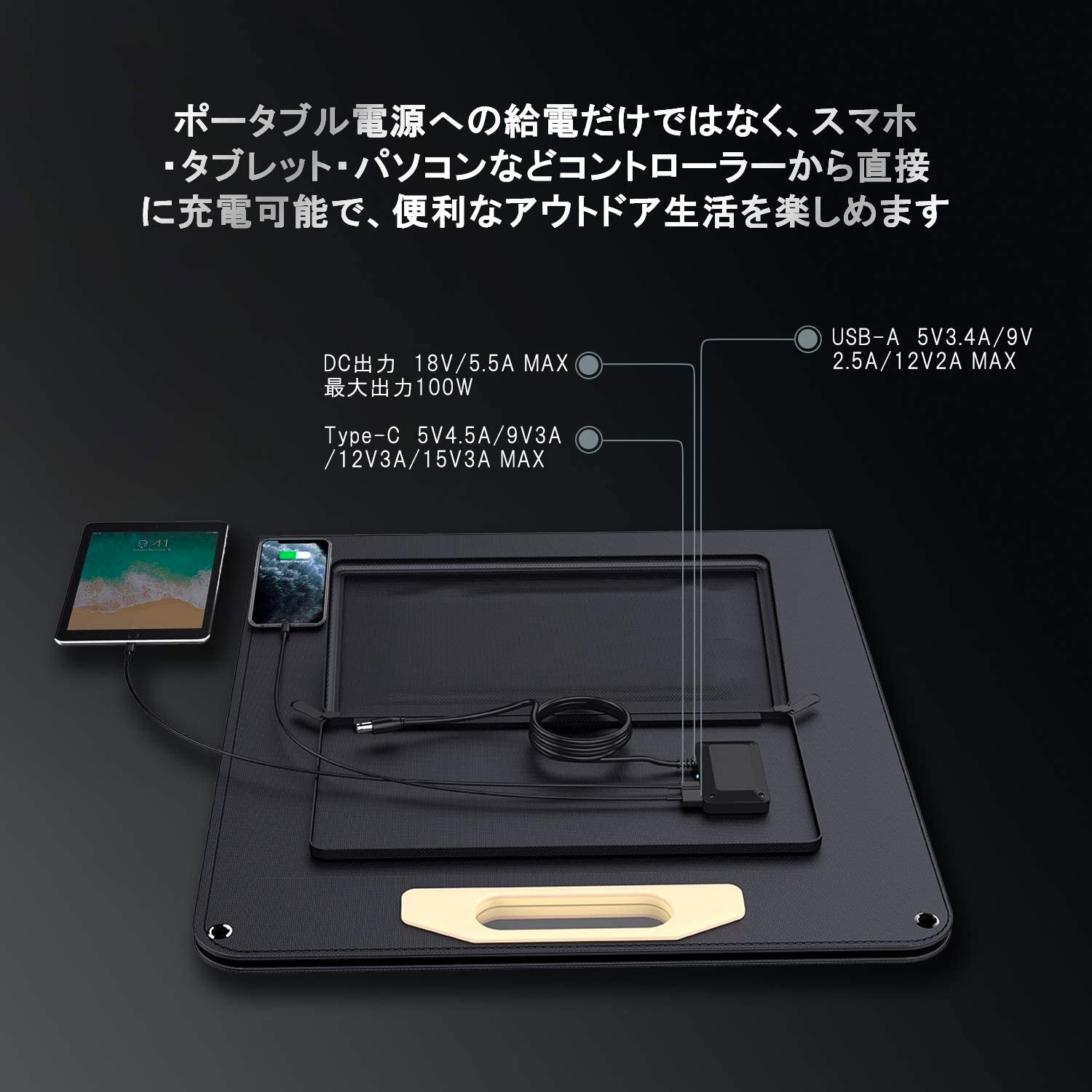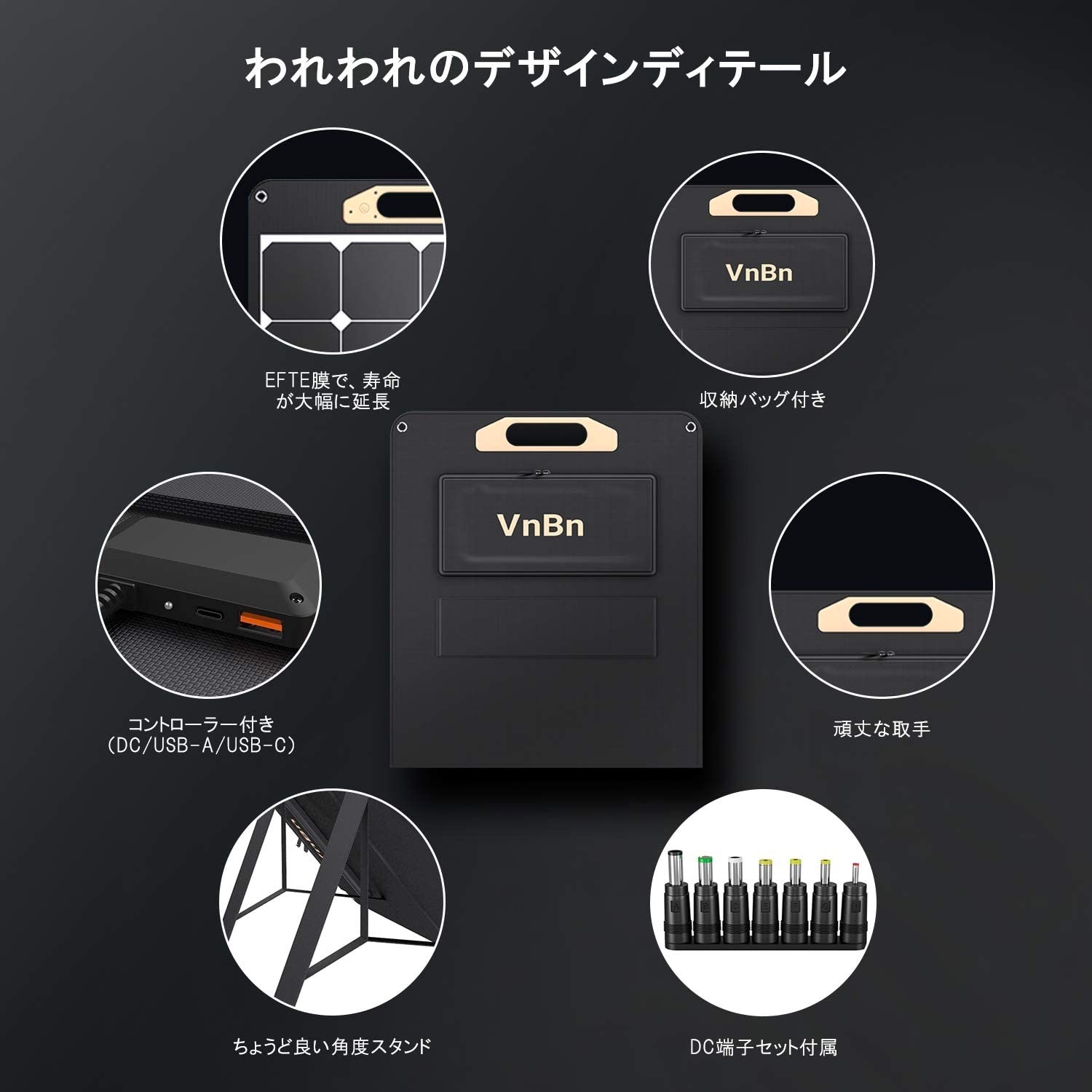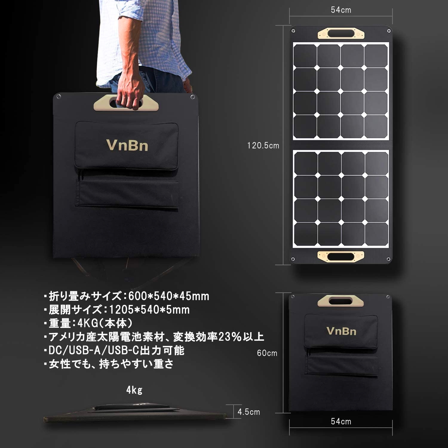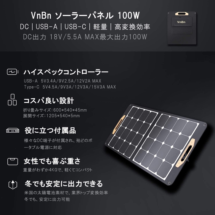 VnBn ソーラーパネル 100W ETFE ソーラーチャージャー 折りたたみ DCポータブル電源充電器 DC/USB-C/USB-A 出力端子 仕様 (100W 18V 5.5A) 高変換効率 超薄型 二折 軽量 コンパクト 単結晶 IPX4防水 スマホ タブレット パソコン 充電可能 アウトドア 防災 停電 キャンプ 非常用 取扱書兼保証書付