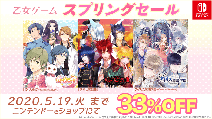 株式会社デジマース(本社:東京都品川区、代表取締役社長:石川 達絵)は、Nintendo Switch(TM)向け乙女ゲーム『にゃんらぶ~私の恋の見つけ方~』『アイリス魔法学園~Vinculum Hearts~』『妖かし恋戯曲』を対象として、33%OFFプライスで提供する期間限定セールを2020年5月19日(火)まで開催致します!
