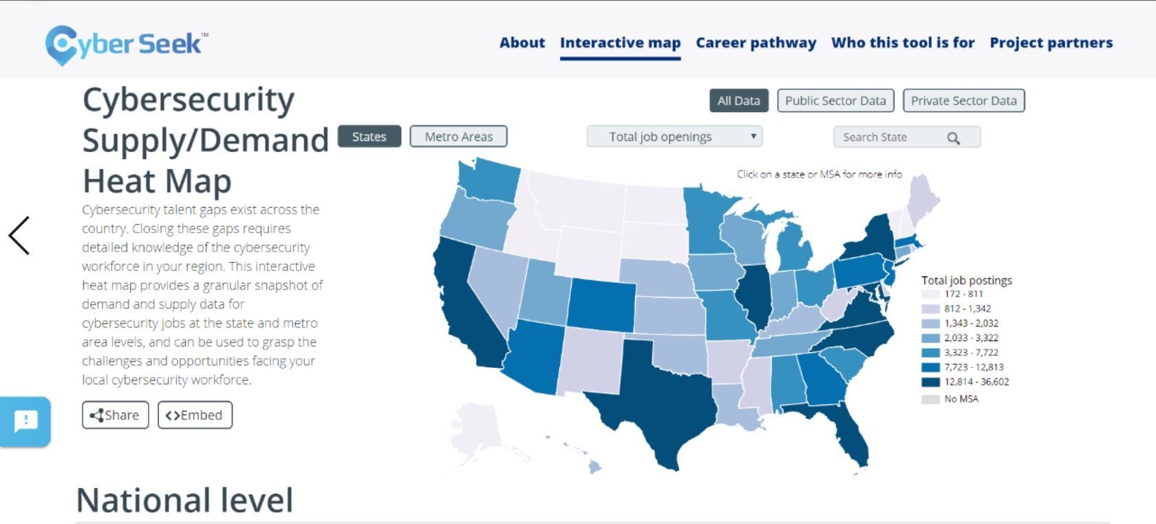 CyberSeekサイトは、全米のサイバーセキュリティプロフェッショナルの需要をより的確に把握し、雇用につなげます。また適切なポジションを得るために必要となるスキルパスを提示し、スキルギャップを埋める取り組みをしています。