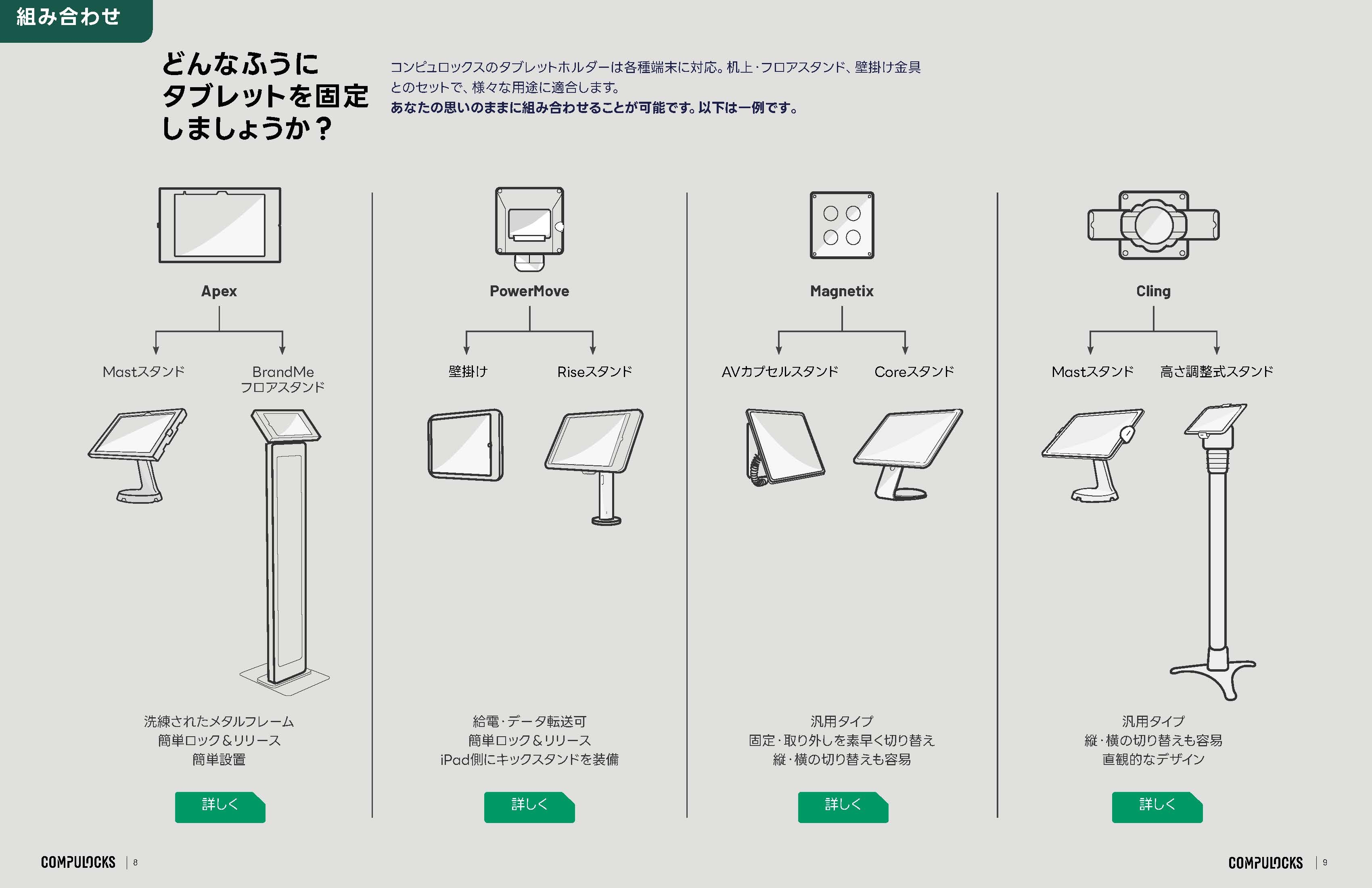 タブレットやPCに十分な盗難防止対策を施しながら、ショップや受付、イベントなどで、アプリをより使いやすく展示したり、スタッフが携わる業務への効果的なデバイスの活用を促す「コンピュロックス」の最新の提案の数々をご覧ください。