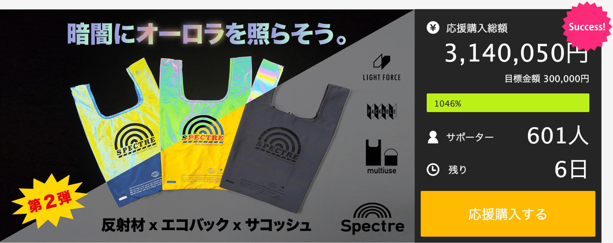 株式会社人間味(東京都千代田区/代表取締役 栗田匠 )が2021年7月27日(火)より応援購⼊サービス「Makuake」にて先行販売を開始した暗闇ライフスタイルブランド『Spectre|スペクトル』の第2弾エコバッグの応援購入金額が3,140,050円(2021/8/24 14:30時点)を突破し、前作の第一弾エコバッグの応援購入金額6,949,910円と合わせて応援購入金額の総額が1000万円を突破いたしました。