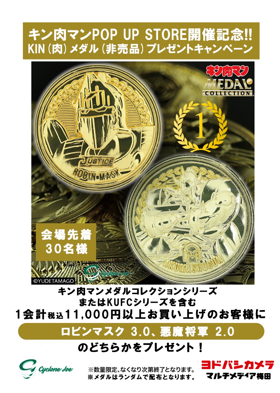 キン肉マンPOP UP SHOP BY ヨドバシカメラ マルチメディア梅田イベント会場にて、キン肉マンメダルコレクション、KUFCシリーズを含む税込11,000円以上お買い上げのお客様に、キン肉マンメダルコレクションKIN(金)肉メダル(ゴールドメッキメダル)非売品を1枚プレゼント!