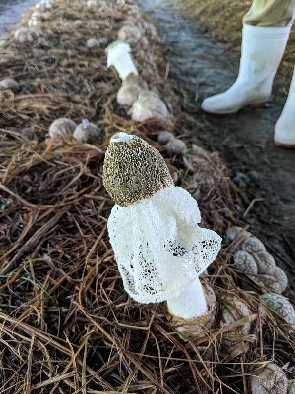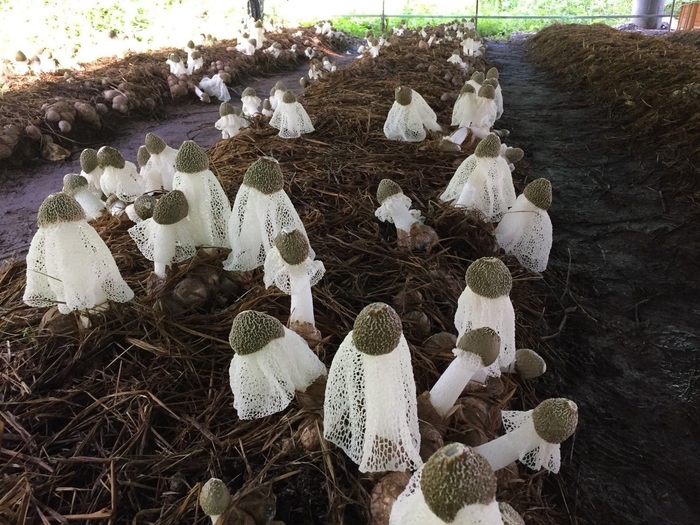 優雅な白いマントを広げる人工栽培のキヌガサタケ。独特の芳香とともに、フレッシュな状態で高級料理店にモニター出荷を開始しています。