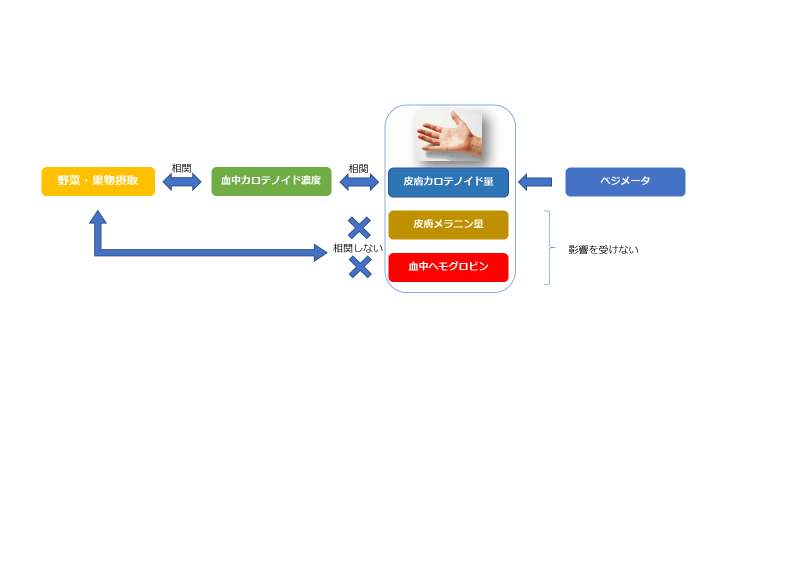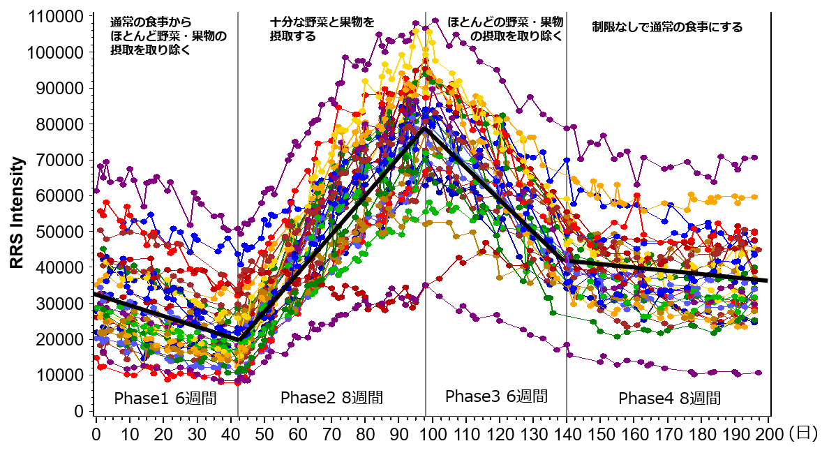 2014年にLisa Jahns博士(アメリカ合衆国農務省USDA)が実施した野菜・果物の介入試験結果では、光学的皮膚カロテノイド測定値(ベジスコア)は、野菜・果物の摂取量に依存することが確認され、介入による値の改善は“2週間以内”に確認できることが示されました。ベジメータは小さな変化も捉えられることができるので、早い段階で効果を知ることができます。