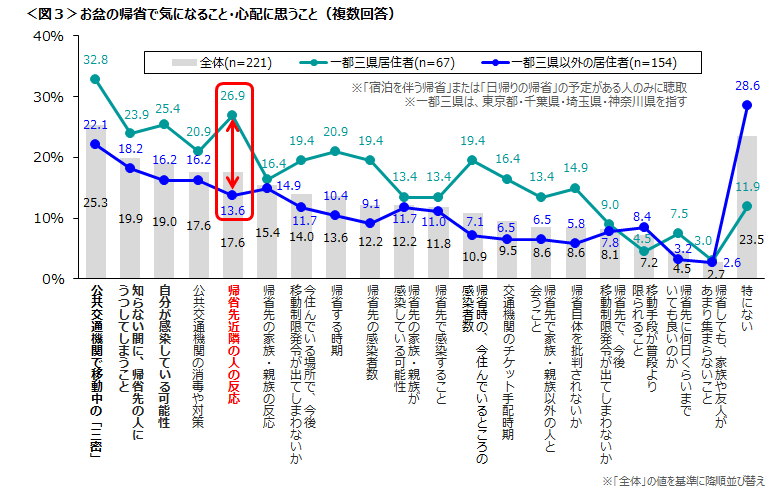 帰省についての最大の心配事は、「公共交通機関で移動中の“三密”」。一都三県居住者では、「帰省先近隣の人の反応」を心配する声が多い。