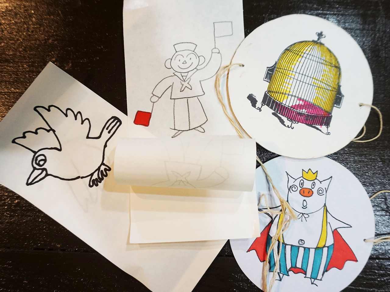 (1)裏表に描いた絵が回転して重なって見える「ソーマトロープ」、2枚の絵を重ねて鉛筆でこするとアニメになる「マジックロール」の2種類を用意しました。簡単な工作でアニメーションが楽しめる光学玩具を作ります。