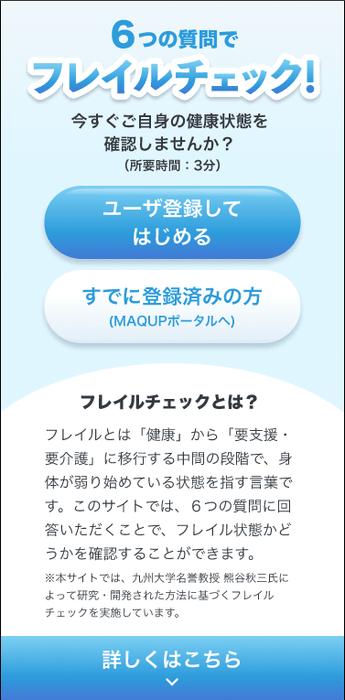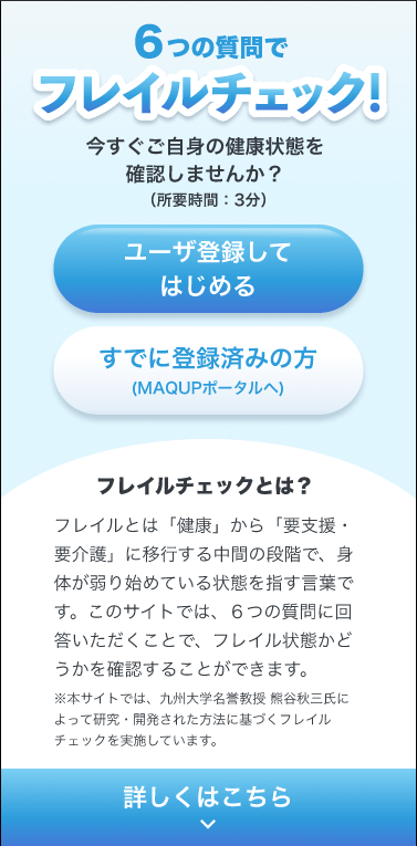 この度、マクニカが提供を開始するフレイル予防サービス「MAQUP」は、Web上で6つの質問に回答することでフレイル状態を早期発見し、地域の運動プログラム提供パートナーと共同で、健康の維持とフレイル状態の改善を目指す運動プログラムを提供するものです。
